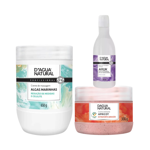Transforme sua rotina de beleza em um ritual de SPA completo com o kit Dagua Natural Algas Marinhas Creme de Massagem 650g + Apricot Esfoliante Extra Forte 300g + Aruk Uva e Cereja Óleo de Massagem 300g! Comece com o Apricot Esfoliante Extra Forte, que promove uma renovação profunda, eliminando células mortas e impurezas para uma pele incrivelmente lisa e receptiva. Em seguida, desfrute da poderosa hidratação e firmeza do Algas Marinhas Creme de Massagem, ideal para massagens relaxantes e modeladoras que nutrem e tonificam a pele. Finalize com o luxuoso Aruk Uva e Cereja Óleo de Massagem, que oferece deslizamento perfeito para suas massagens, além de nutrir, prevenir estrias e deixar a pele com um toque aveludado e um aroma delicioso. Este trio é a combinação perfeita para uma pele radiante, macia, hidratada e com uma sensação de bem-estar inigualável, elevando seu autocuidado a um nível profissional.