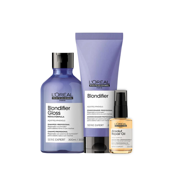 Kit L'Oréal Professionnel Blondifier Gloss: Shampoo Iluminador (300ml) + Condicionador Iluminador (200ml) + Óleo Absolut Repair (30ml)