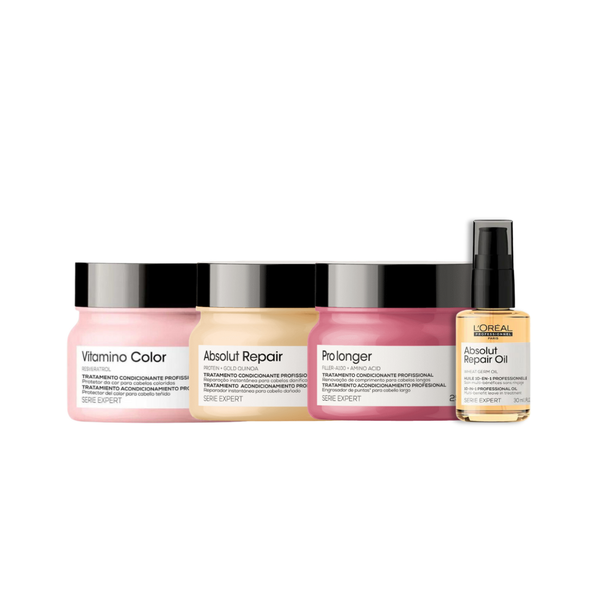 Kit Cronograma Capilar L'Oréal Professionnel: Máscara Absolut Repair (250ml) + Máscara Pro Longer (250ml) + Máscara Vitamino Color (250ml) + Óleo Absolut Repair (30ml)