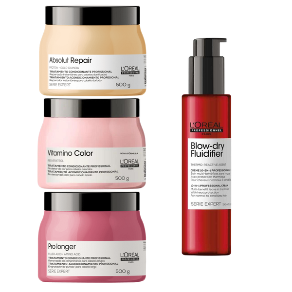 Kit Cronograma Capilar L'Oréal Professionnel Tamanho Salão Completo para Cabelos Longos e Coloridos: Absolut Repair, Pro Longer, Vitamino Color (500ml cada) + Blow Dry Fluidifier (150ml)