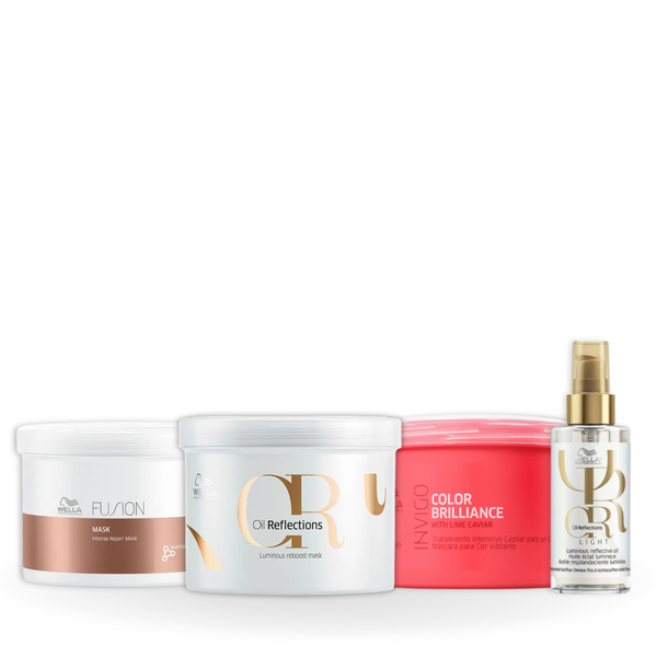 Eleve o cuidado dos seus cabelos finos a normais a um novo patamar com o Kit Wella Cronograma Capilar Profissional Completo para Brilho e Leveza! Este conjunto de alto desempenho combina a reparação profunda da Máscara Fusion (500ml), a proteção e realce da cor da Máscara Brilliance (500ml), a nutrição luxuosa e luminosidade da Máscara Oil Reflections (500ml) e o toque final de brilho suave e controle do frizz do Óleo Oil Reflections Light (100ml). Ideal para quem busca um tratamento intensivo e versátil sem adicionar peso, este cronograma capilar completo restaura a força, protege a cor, nutre profundamente e proporciona um brilho saudável com uma finalização leve e controlada, deixando seus cabelos deslumbrantes em todas as etapas do cuidado. Invista na saúde e beleza dos seus fios com a qualidade profissional Wella!