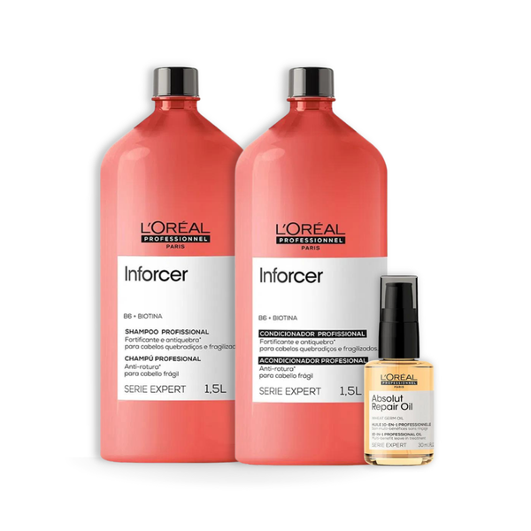 Kit L'Oréal Professionnel Inforcer Anti-Quebra Tamanho Salão: Shampoo Fortificante (1500ml) + Condicionador Fortificante (1500ml) + Óleo Absolut Repair (30ml)