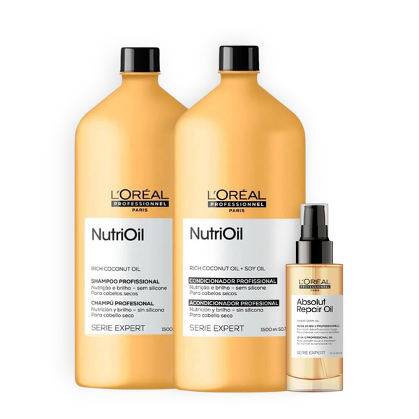L'Oréal Professionnel NutriOil Duo Nutrição e Brilho Tamanho Salão + Óleo Absolut Repair: Shampoo, Condicionador e Óleo para Cabelos Secos