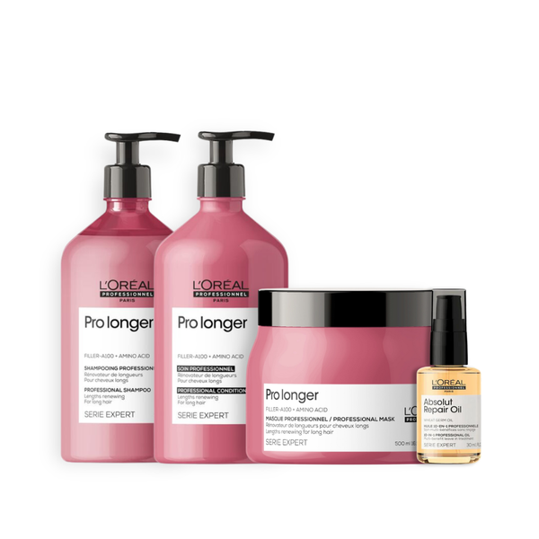 Kit L'Oréal Professionnel Pro Longer Tamanho Salão Completo: Shampoo Preenchedor de Pontas (750ml) + Condicionador Renovador de Comprimentos (750ml) + Máscara Preenchedora de Pontas (500ml) + Óleo Absolut Repair (30ml)