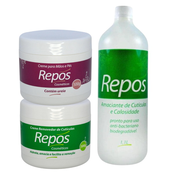 Kit Repos Trio Profissional Plus: Amaciante, Removedor e Hidratação Intensiva para Pés e Mãos - Tamanho Salão