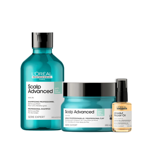 Kit L'Oréal Professionnel Scalp Advanced Anti-Oleosidade Intensivo: Shampoo Purificante (300ml) + Máscara Purificante (250ml) + Óleo Absolut Repair (30ml)