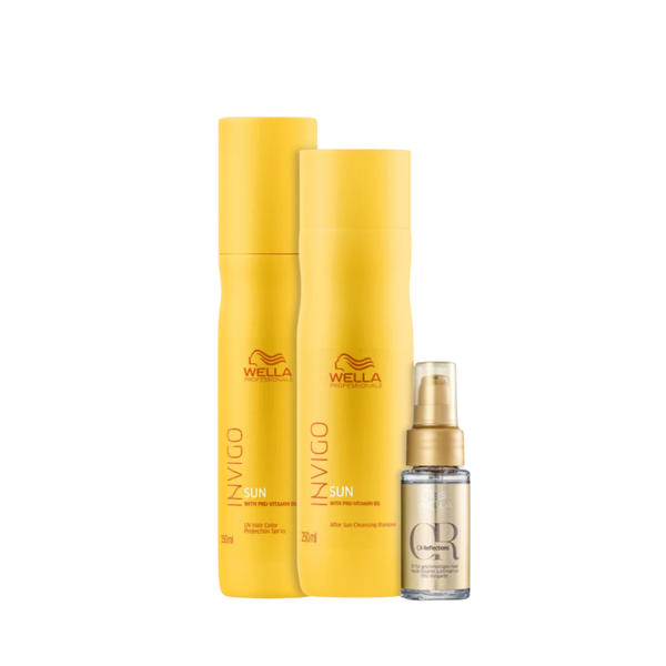 Proteja seus cabelos do sol com o kit Wella Sun! ☀️ Cabelos expostos ao sol, água do mar e cloro precisam de cuidados especiais. O kit Wella Sun, com shampoo, leave-in e óleo, é a solução completa para manter seus fios saudáveis, hidratados e protegidos dos danos causados pela radiação solar. Com fórmula exclusiva, rica em ingredientes nutritivos, ele limpa profundamente, hidrata intensamente e cria uma barreira protetora que impede o ressecamento e a descoloração dos fios. Ideal para quem busca cabelos radiantes e saudáveis durante todo o verão!